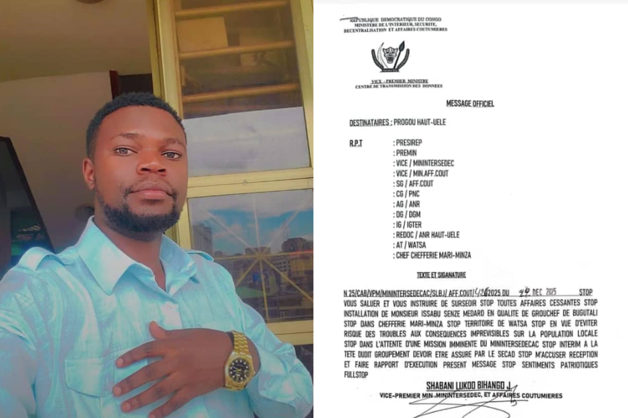 Le climat social au sein de la chefferie Mari-Minza respire à nouveau. Stanislas Tsoro, leader d’opinion et figure de la jeunesse progressiste de Watsa, a publiquement exprimé sa satisfaction à la suite du télégramme du Vice-Premier ministre, Ministre de l’Intérieur et de la Sécurité, Jacquemain Shabani, ordonnant le report de l’installation contestée de M. Isabhu Menge Médard à la tête du Groupement Bugutali.
