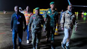 À son arrivée à l’Aéroport international de la Luano, le commandant de la 22ᵉ région militaire a été accueilli par plusieurs responsables militaires. Il a ensuite salué la troupe présente avant de quitter les lieux.
